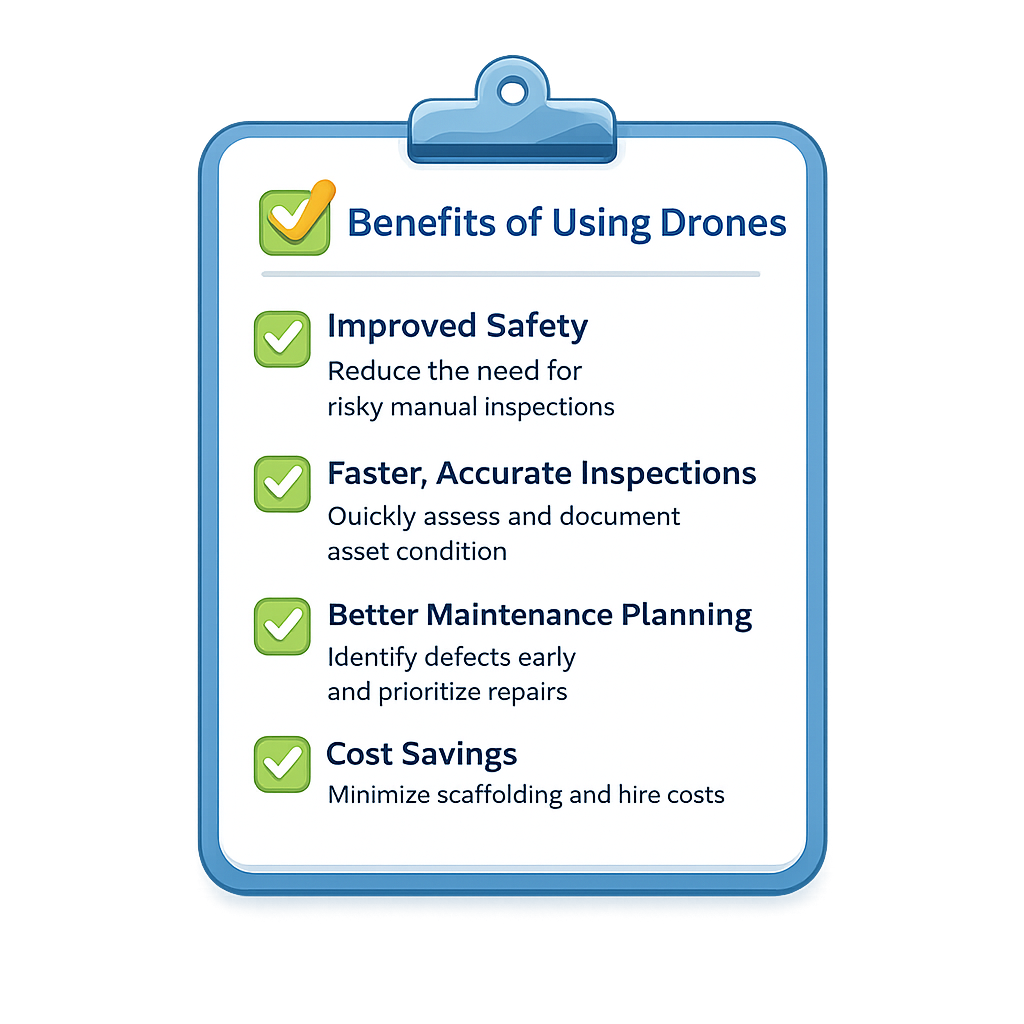 Using drones reduces the need for working at height or deploying costly access equipment. Inspections can be completed safely from the ground, minimising risk to staff and the public.